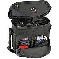 Quite roomy for a small camera bag. I had a difficult time finding a small camera bag that could fit my camera. This top-loading bag can hold a larger SLR with a battery grip, hand strap and medium zoom lens attached with a non-reversed lens hood. And there's room for more -- another lens or two or a flash unit and some smaller items like batteries, filters, memory cards, film, etc. The padded lens compartment dividers are velcroed and can be adjusted to fit your equipment. The right and left lens compartments can be further sub-divided with two included padded velcro partitions but I don't find it very useful to stack equipment in this fashion.